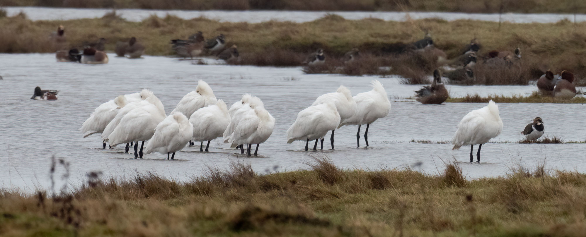 There were up to four Slavonian Grebes off shore during the month and the Spoonbill group totalled 14 adults splitting their time between Inchmery Saltmarsh and De L’Orne Scrape.