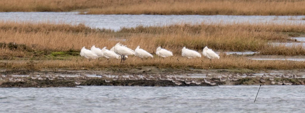 From the Sailing Club 10 Spoonbill were loafing on Inchmery Saltmarsh and just in front of them the Purple Sandpiper (see arrow below) was resting in the Dunlin roost.