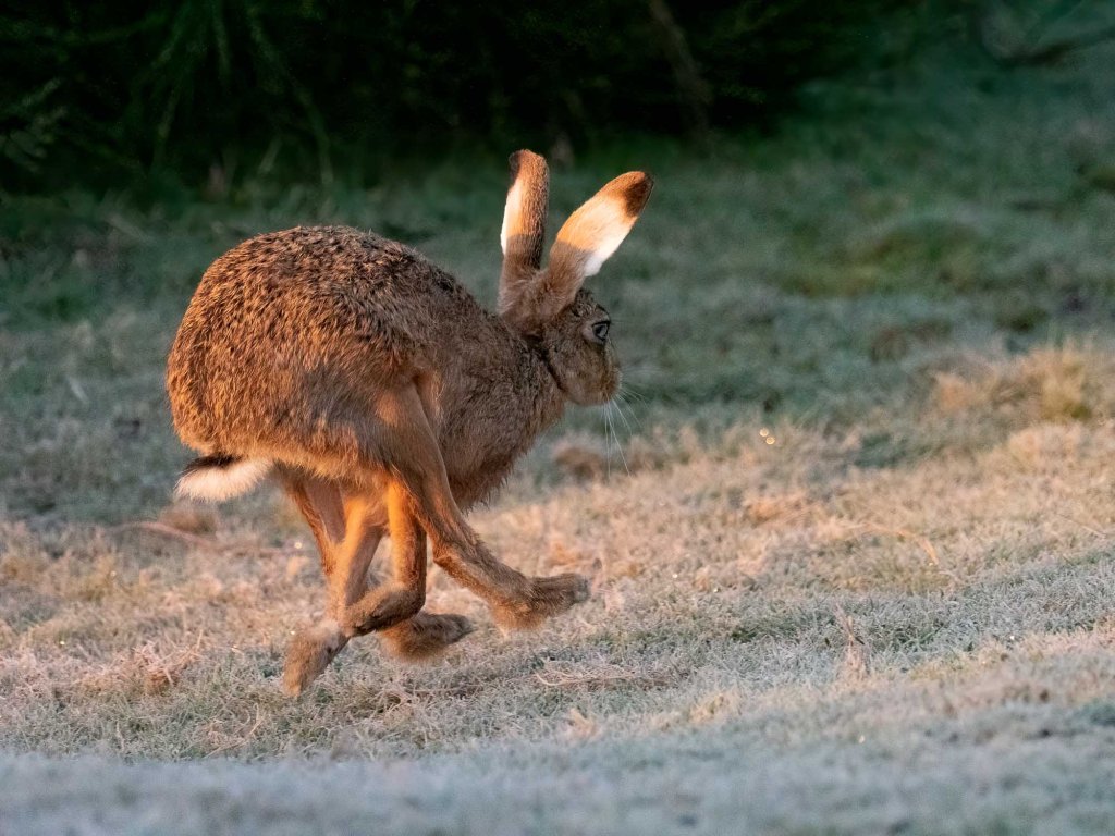 A Brown Hare trotted towards me near Mary Monts and allowed some photos as it headed away. You can see the rufous colour, long legs, black-tipped ears and also the tail held low unlike the Rabbit which holds it up flashing the white more obviously.