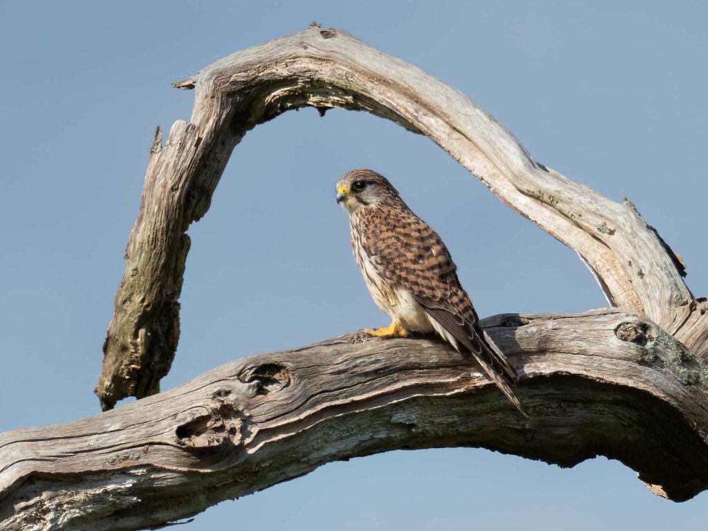 Nearby, the female Kestrel was perched in the Bee-eater trees. Although it’s a large area I think there is only one breeding pair of Kestrel at Needs Ore. They breed near Black Water House and the female is often nearby as I drive past. She may well be on eggs now as she rarely ventures far but the male is seen regularly all over the reserve finding food to bring back to her.