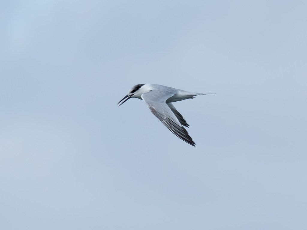 Two Sandwich Terns were patrolling the river and one of them showed dark primary coverts which made me wonder if it was a 1st summer bird. This would be unusual as the vast majority of terns (including Sandwich Terns) remain in their winter quarters (including Gambia and Senegal) during their first summer. Having spoken to Graham, I think that this may be an adult which has, unusually, retained several dark primary coverts, the rest of the wing looked clean and the tail was all white.