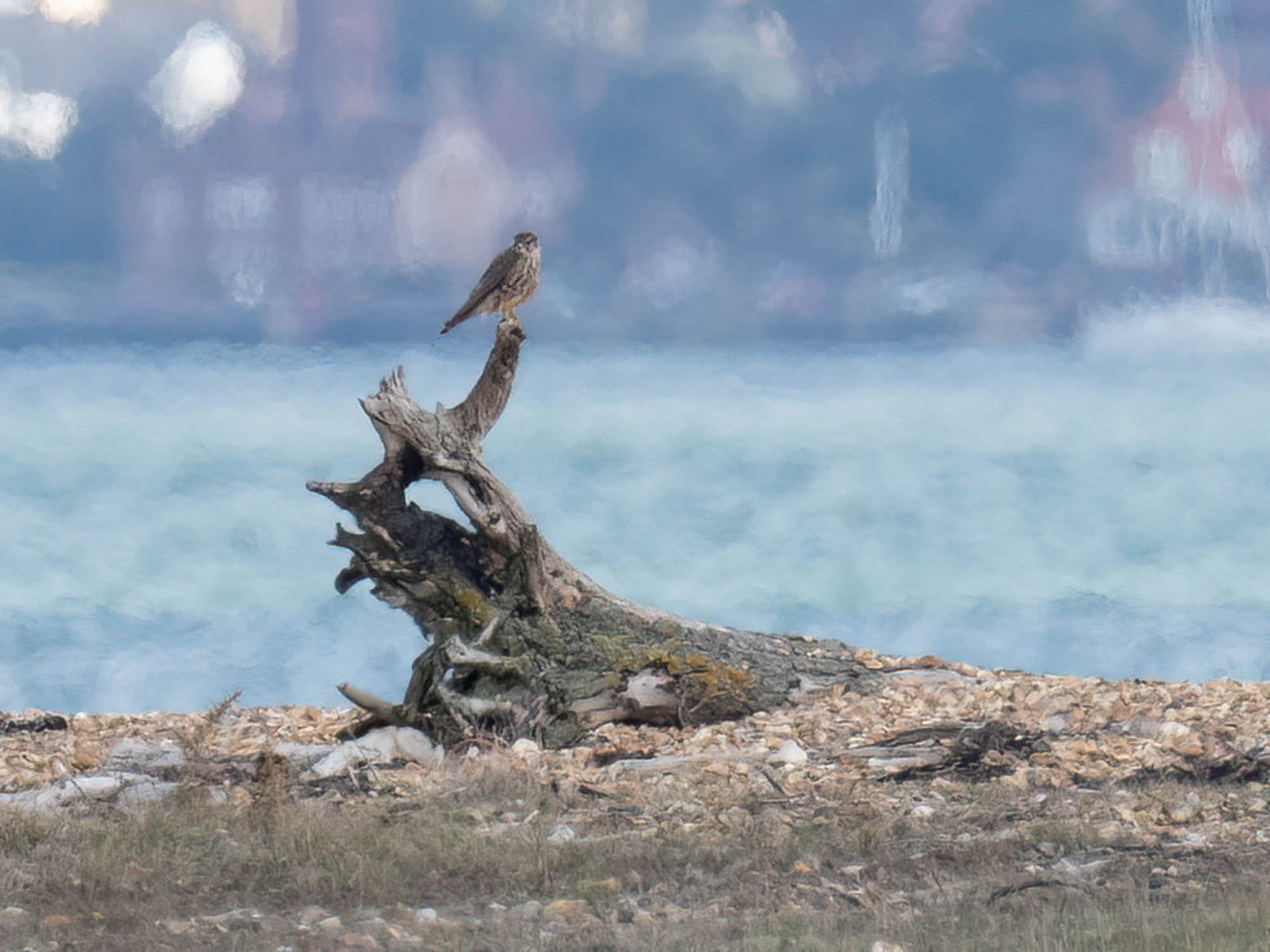 I finally had a Merlin for the year, a large looking female dashed out across in front of me when I was at Wheatear Corner and then landed on the up-turned tree roots on the shingle ridge. Once the clouds covered the sun the heat haze softened slightly and I could get a record shot. She will be heading north soon to breed on the moors in Wales, Northern England or Scotland.